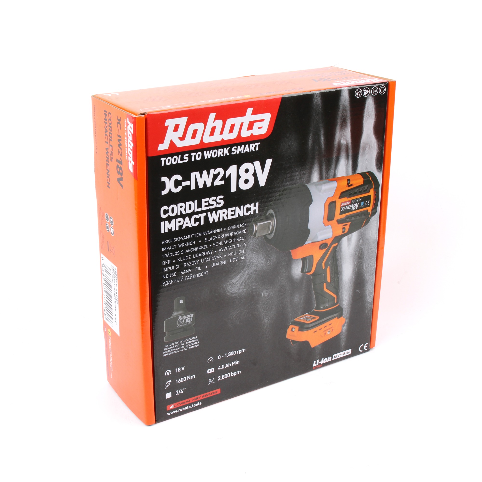 Robota DC-IW218V on raskaan sarjan iskevä akkumutterinväännin, joka tarjoaa jopa 1600 Nm vääntövoimaa kaikkein tiukimpien pulttien ja muttereiden avaamiseen. Laite sopii erinomaisesti raskaaseen kone- ja ajoneuvokäyttöön, missä tarvitaan suurta voimaa ja luotettavuutta. Mukana toimitettava 3/4″–1/2″ adapteri tuo lisää valikoimaa hylsyvalintoihin.